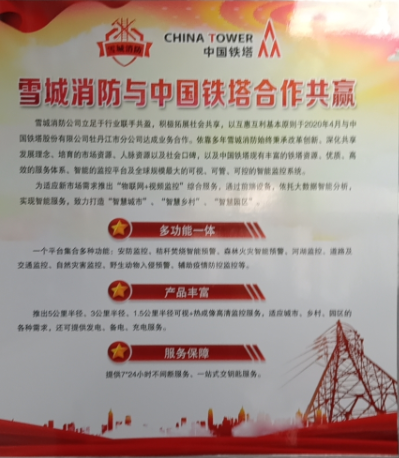 雪城消防公司立足于行业联手共赢,积极拓展社会共享,以互惠互利基本原则于2020年4月中国铁塔股份有限公司牡丹江市分公司达成业务合作。依靠多年雪城消防始终秉承改革创新、深化共享发展理念、培育的市场资源、人脉资源以及社会口碑,以及中加铁塔现有的铁塔资源、优质、高效的服务休系、智能的监控平台及规模大的可视、可管、可控的智能监控系统。